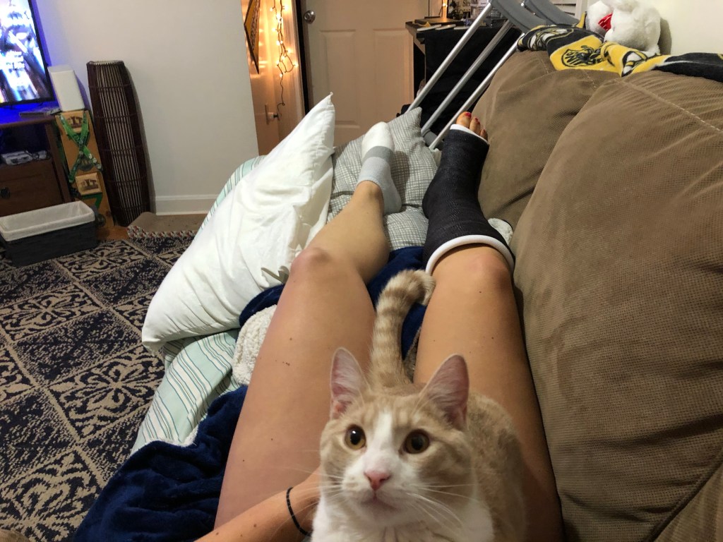 Day #6: Today is not been a good day. I woke up in a lot of pain. To the point where it’s almost been completely unbearable and I can’t find a position that I’m comfortable in without bringing me to tears. My leg is very achy and my ankle is killing me. And the cast just seems exceptionally heavy today. My spirits and mood are also not in a good spot either. I am feeling very sorry for myself, very unmotivated, very jealous that my boyfriend is running a race right now which has led to a lot of tears this morning already and it’s only 9:27 in the morning. I am so jealous. So here I am sitting on the couch with a bag of goldfish and luckily my two nurses a.k.a. my kittens who know mom needs some extra love today. This is going to be a long recovery time.