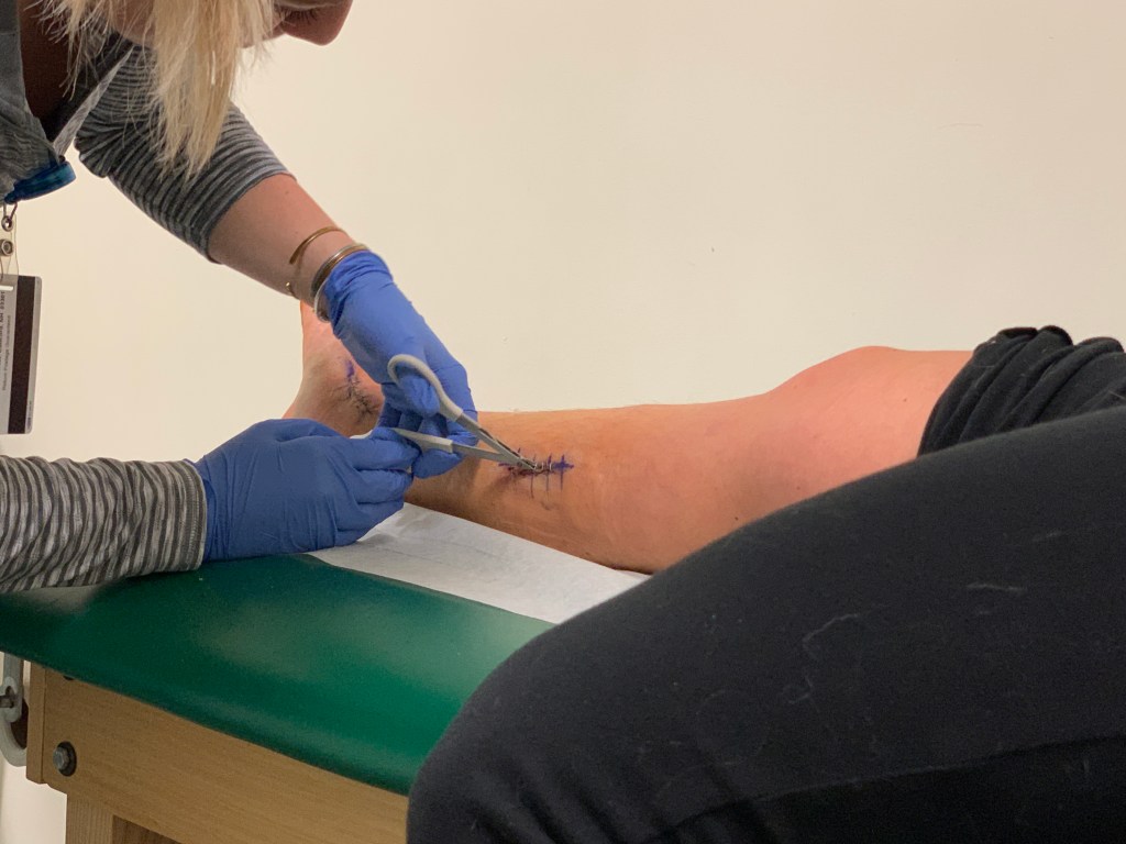 Best part… I asked if I could clean my leg and they gave me a towel and a cleaning/ moisturize spray. It was heaven. I got to clean the extra skin off my leg, itch it at the same time, just get all the grim from the last 6 weeks off my leg! Had to stay away from the incisions but that was okay! Spent a good 10 minutes cleaning especially my toes!