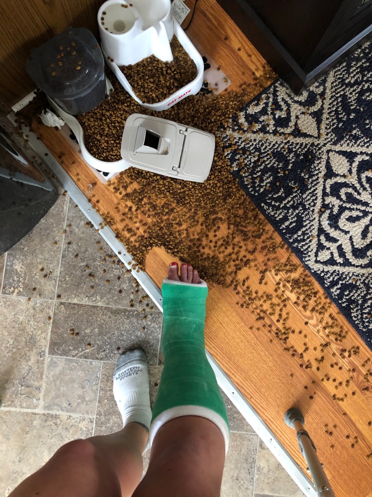 And then this… I try and be helpful… like feed the cats…. and the container pops open and goes everywhere (picture below). And the worst part… I can’t clean it up. I attempted to sweep it into a pile but I can’t use the dUstpan to pick it up. Nor can I get them new water because I can’t lift the automatic bowl to clean it out. It’s so frustrating. I feel like I still can’t even be helpful or do anything around the house. And I feel bad for my boyfriend who had to come home early from work and deal with it.
